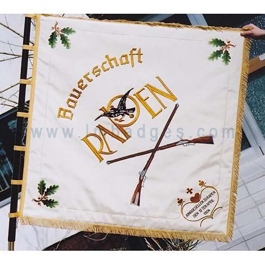 We are Manufacture and Exporter of Hand Embroidery Flags - Embroidered Banner - Table Small Banners - Fashion Badges Flags and Banners - Patches Flags and Banners - Labels Flags and Banners - Crests Flags and Banners - Logos Flags and Banners - Insignia Flags and Banners - Emblems Flags and Banners using Gold, Silver Bullion Wire thread - Gold and Silver Mylar Thread - Gold and Silver thread Wire and any coloured cotton threads. We can make to any size, any sketch, drawing, or picture. In a couple of days we can send the scanned image of the first sample and within a week the actual sample is in the customer?s hands.